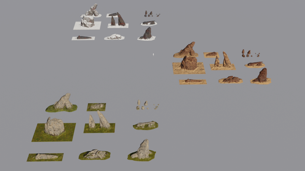 Rocks 3D Kit for concept art. You will get 9 set of rocks, 9 different 4k materials and a quick tutorial on how to use and set up some material controls. Blender file.
